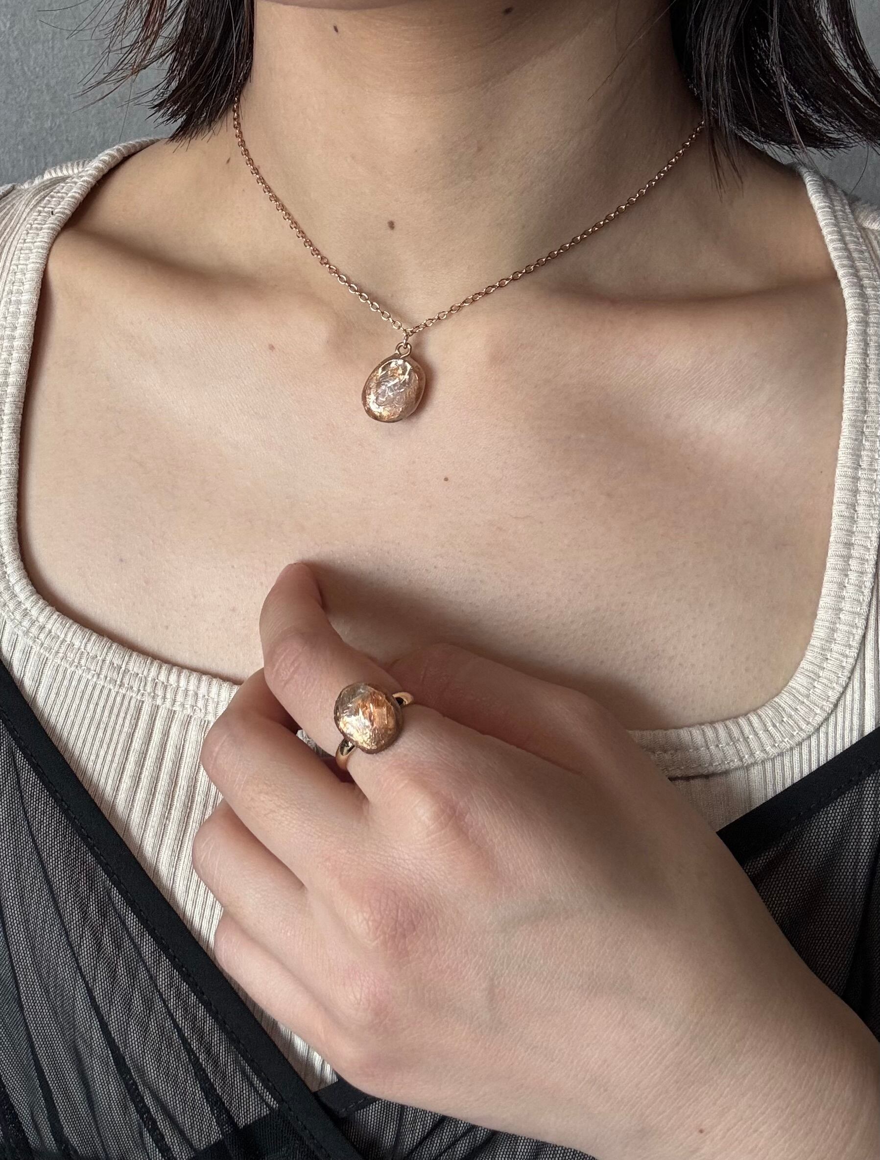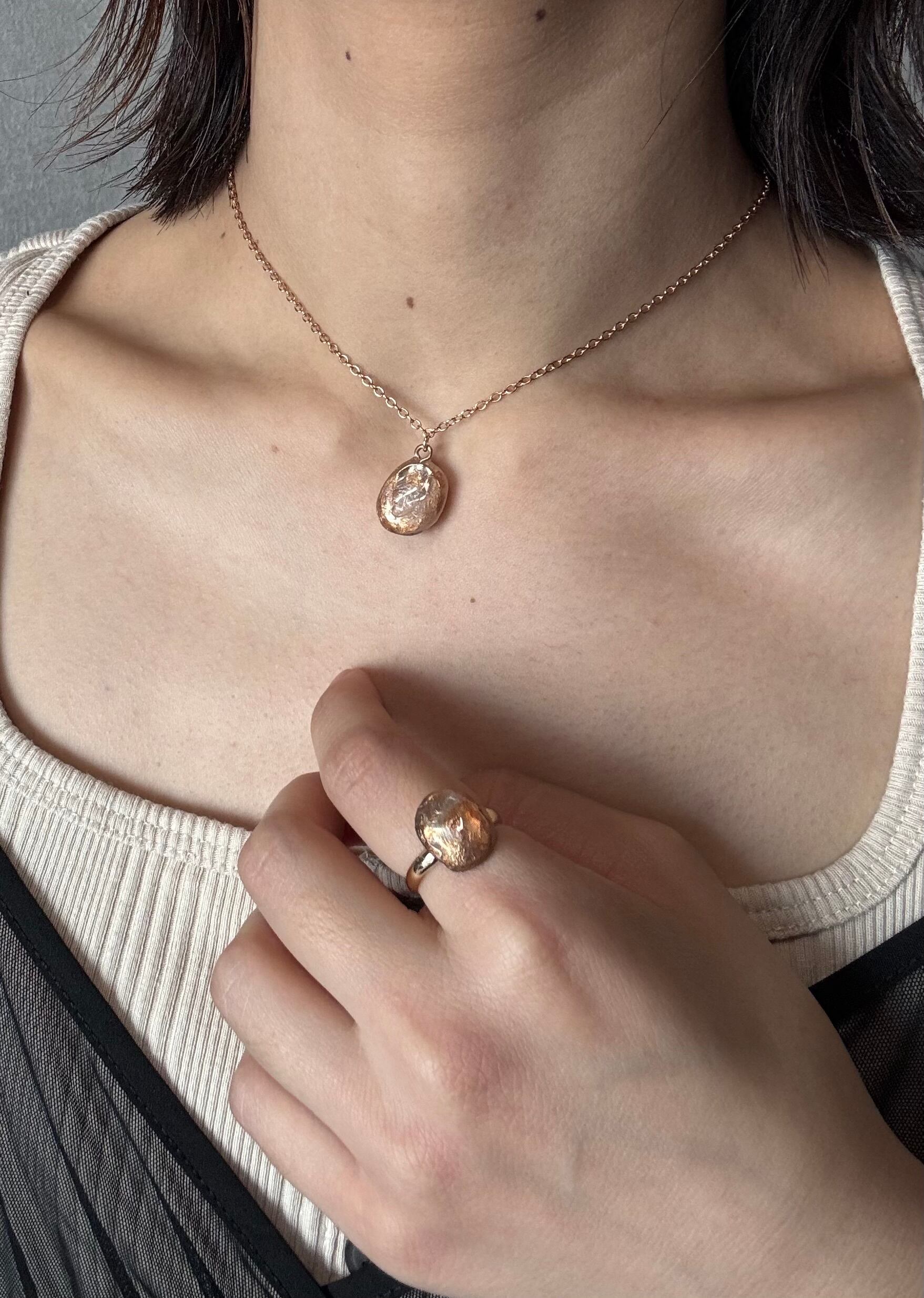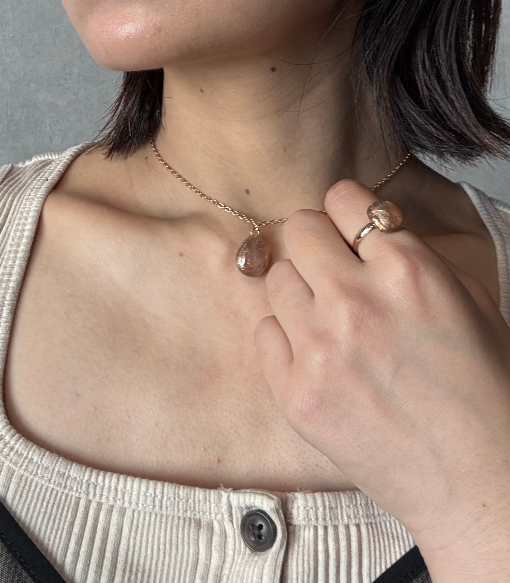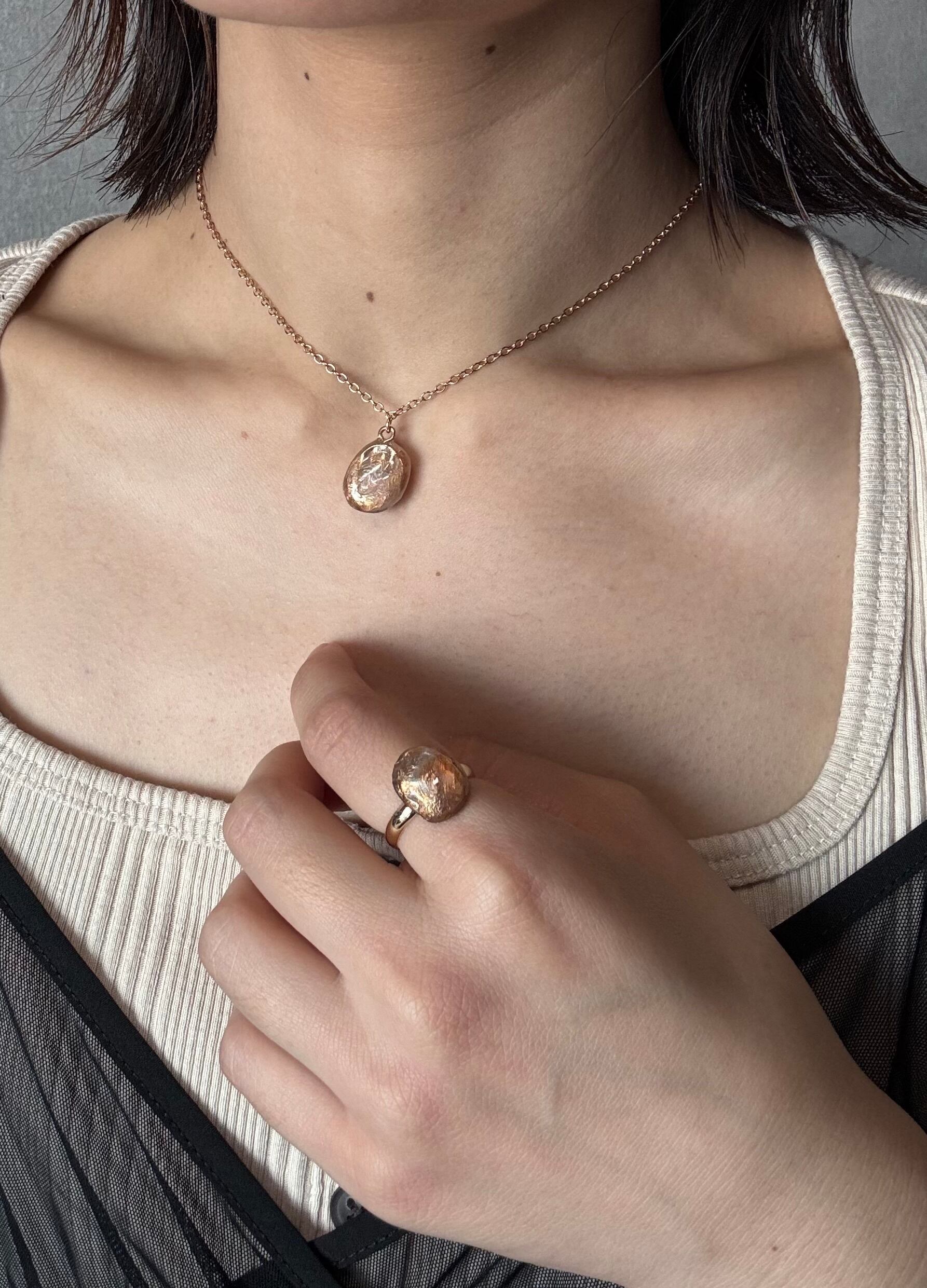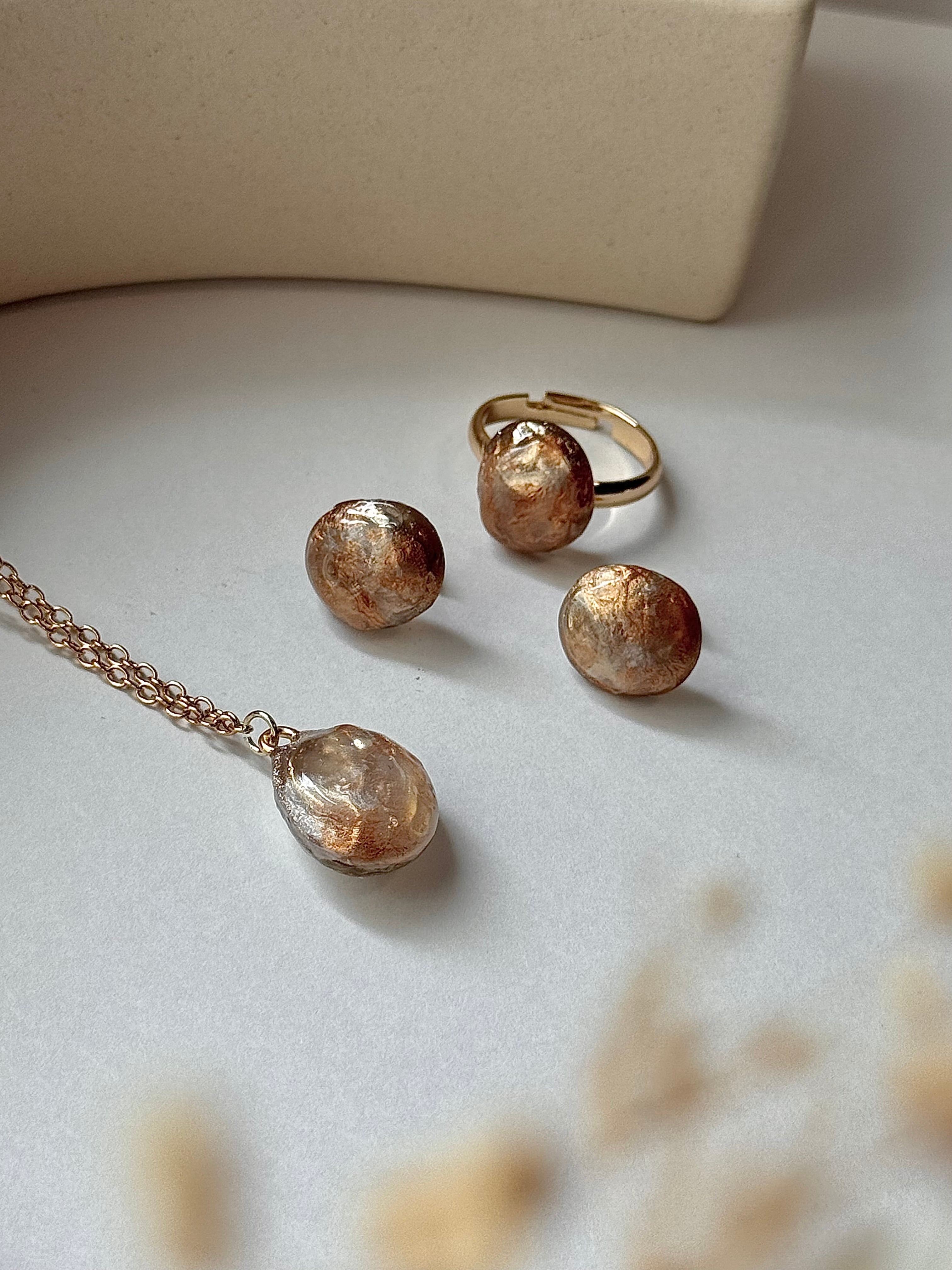 もともとは、リバーシブルネックレスの裏側のみの予定でしたが、あまりにも可愛いので、急遽こちらの耳飾りやリングの新作デザインにも落とし込みました。