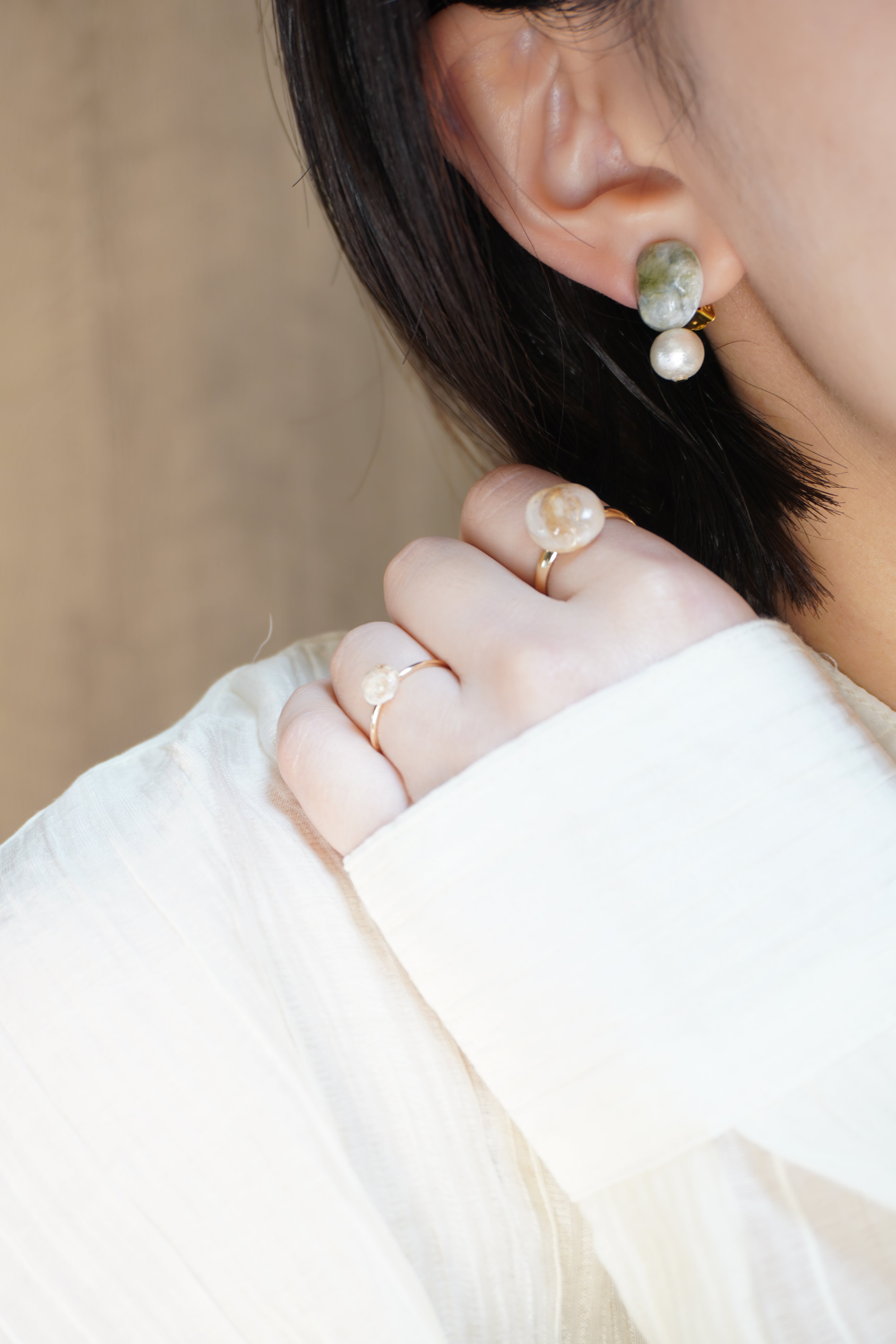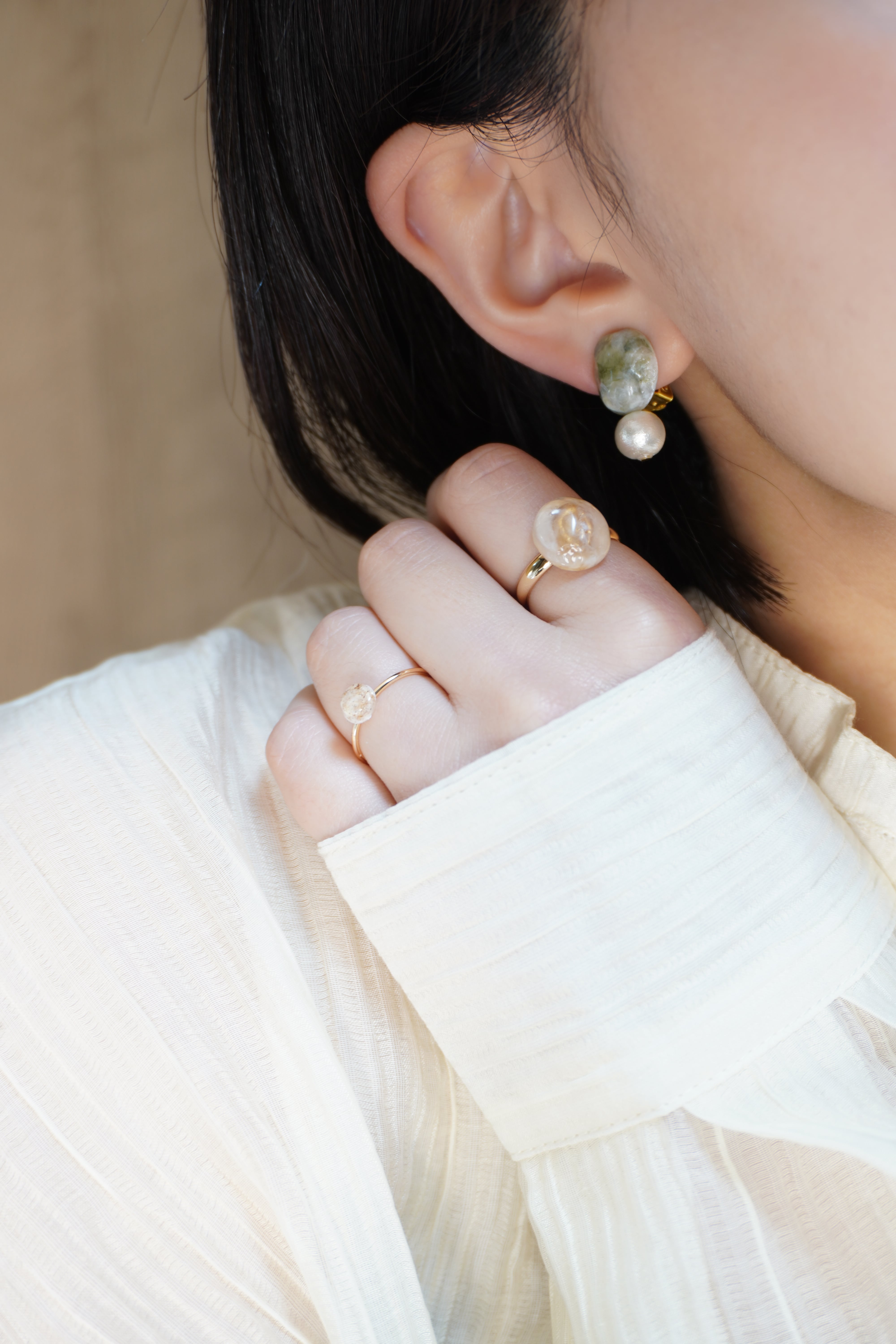 飾りにはコットンパールを使用し、上品で軽やかな印象。