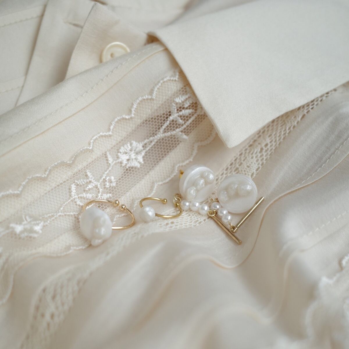 でこぼことした立体的なパールのため、定番のホワイトパールアクセサリーとは異なり、バロックパールのような風合いとなり個性的なデザインとなりました。